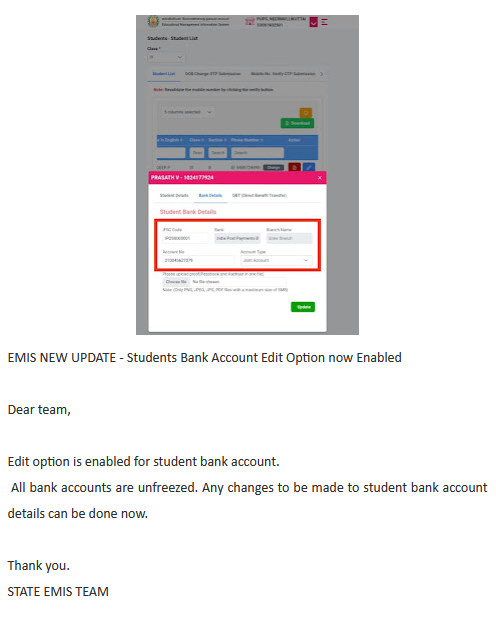 EMIS NEW UPDATE – Students Bank Account Edit Option Now Enabled