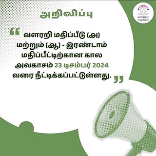 TNSED – வளரறி மதிப்பீடு முடிக்க கால அவகாசம் நீட்டிப்பு. வளரறி மதிப்பீடு ( அ ) மற்றும் ( ஆ ) – இரண்டாம் மதிப்பீட்டிற்கான கால அவகாசம் 23 டிசம்பர் 2024 வரை நீட்டிக்கப்பட்டுள்ளது.